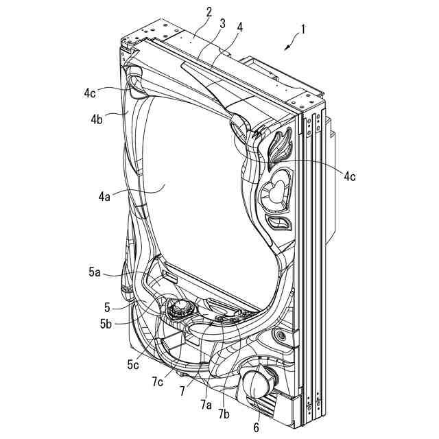 一体扉ユニット4は、矩形の扉状に形成されている。一体扉ユニット4は、略中央部に配設された透明板4aと、透明板4aの周囲に配設された装飾部4bと、透明板4aの下側に配設された受皿ユニット5と、受皿ユニット5の側方に配設された発射ハンドルユニット6と、を有している。