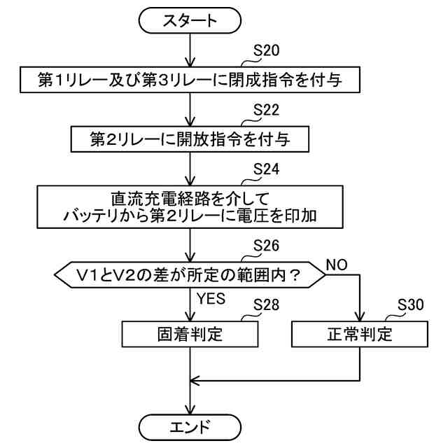 上記したいくつかの実施形態において、固着検出処理は、電圧を印加する処理の前に、第1リレーに閉成指令を与える処理をさらに含んでもよい。この場合、電圧印加する処理は、直流充電経路を介して、バッテリから第2リレーに電圧を印加してもよい。このような構成によると、固着検出処理では、交流充電経路をバッテリから電気的に遮断しつつ、直流充電経路を介してバッテリから第2リレーに電圧が印加される。
