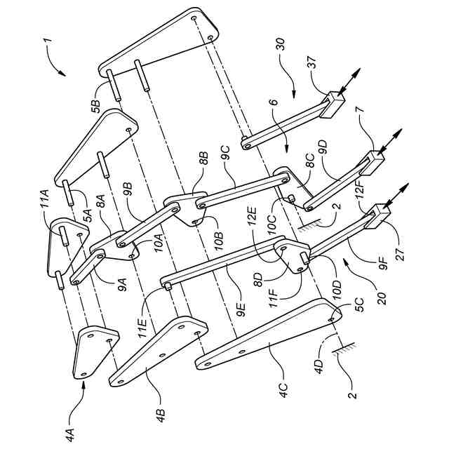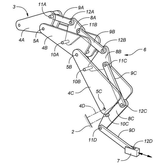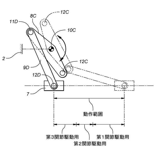 図10は、リンク機構103を作動させるための駆動機構として平行リンク機構106を備えたロボット101の概略構成図である。図10に示すように、平行リンク機構106は、第2関節5Bに枢支される第1ロッカー108Aと、第1リンク4Aの第1関節5A以外の部分と第1ロッカー108Aの遊端側とを連結する第1ロッド9Aとを備える。また、平行リンク機構106は、第3関節5Cに枢支される第2ロッカー108Bと、第1ロッカー108Aの遊端側と第2ロッカー108Bの遊端側とを連結する第2ロッド9Bとを備える。第2ロッカー108Bの遊端側は、第3ロッド9Cを介して直動アクチュエータ107に連結される。