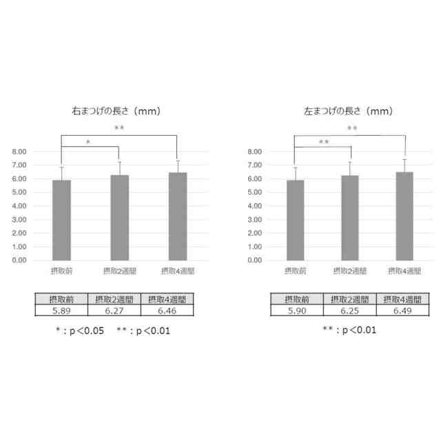 摂取前、摂取2週間後、摂取4週間後の左右のまつ毛の長さの平均値を示すグラフである。縦軸がまつ毛の長さを示す。