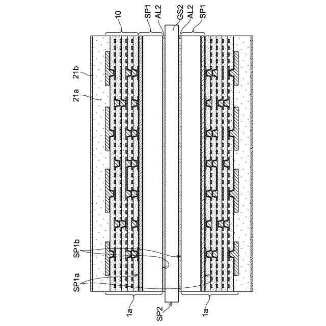 第1ビルドアップ部10は比較的微細な配線を含んでおり、比較的密度の高い回路配線を有し得る。図1の例では、第1ビルドアップ部10は、交互に積層される絶縁層(第1絶縁層)11と導体層(第1導体層)12とを有している。一層の第1絶縁層11を挟んで対向する導体層12同士はビア導体(第1ビア導体)13によって接続されている。第1導体層12は、所定の導体パターンを有するようにパターニングされている。第1ビルドアップ部10の第1面10Fは、第1導体層12の表面(上面)および導体層12のパターンから露出する第1絶縁層11の表面(上面)によって構成されている。図示の例では、第1面10Fを構成する導体層12は複数の導体パッド12pを有するパターンに形成されている。