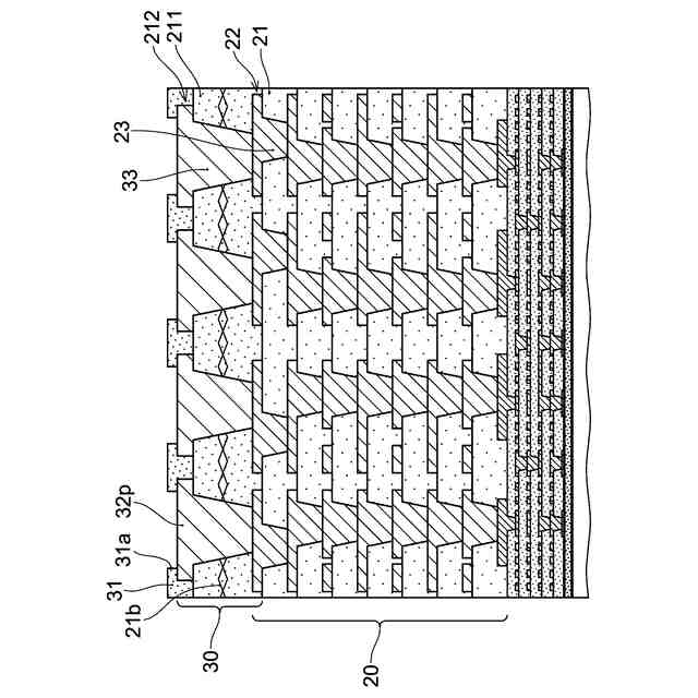 第1ビルドアップ部10は比較的微細な配線を含んでおり、比較的密度の高い回路配線を有し得る。図1の例では、第1ビルドアップ部10は、交互に積層される絶縁層(第1絶縁層)11と導体層(第1導体層)12とを有している。一層の第1絶縁層11を挟んで対向する導体層12同士はビア導体(第1ビア導体)13によって接続されている。第1導体層12は、所定の導体パターンを有するようにパターニングされている。第1ビルドアップ部10の第1面10Fは、第1導体層12の表面(上面)および導体層12のパターンから露出する第1絶縁層11の表面(上面)によって構成されている。図示の例では、第1面10Fを構成する導体層12は複数の導体パッド12pを有するパターンに形成されている。
