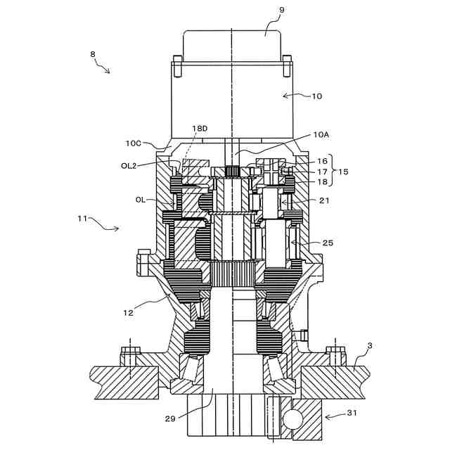 【解決手段】内部に潤滑油OLが貯留されるハウジング12と、ハウジング12内に上・下複数段に設けられ、旋回モータ10の回転を減速する遊星歯車機構15,21,25と、出力軸29とを有する旋回減速機11において、複数段の遊星歯車機構15,21,25は、最上段に位置し、ハウジング12内における潤滑油OLの液面OL1よりも上方に位置する第一段遊星歯車機構15と、第一段遊星歯車機構15よりも下段に位置し、ハウジング12内における潤滑油OLの液面OL1よりも下方に位置する第二及び第三段遊星歯車機構21,25とを含み、第一段遊星歯車機構15には、旋回モータ10の回転時に潤滑油OLを上方へ導くためにキャリア18の外周部に形成した凹部18Dを含む第1導油機構を設ける。