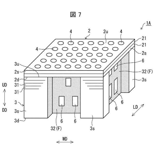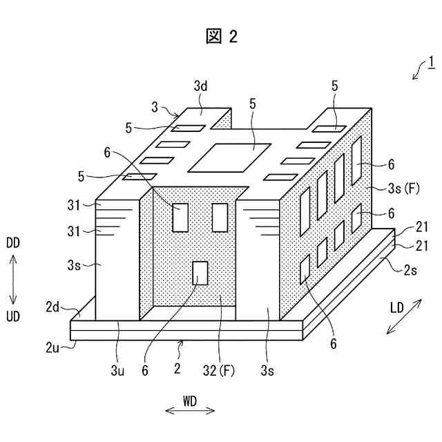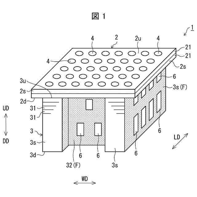 本願の明細書及び特許請求の範囲において、「第1方向」とは、配線基板の幅方向、換言すれば、配線基板の高さ方向に直交する一方向を意味する。高さ方向は、配線基板の上下方向である。以下、第1方向を便宜的に幅方向と称する。「第2方向」とは、高さ方向および第1方向に直交する方向である。以下、第2方向を便宜的に長さ方向と称する。「矩形状」とは、厳密な矩形形状に限るものでなく、例えば角部が湾曲状になっていても、全体的に矩形状として視認できる形状を含む意である。「内側」とは、配線基板の外表面よりも内部の側を意味する。図面中、「WD」は幅方向、「LD」は長さ方向、「UD」は上方向、「DD」は下方向をそれぞれ指している。