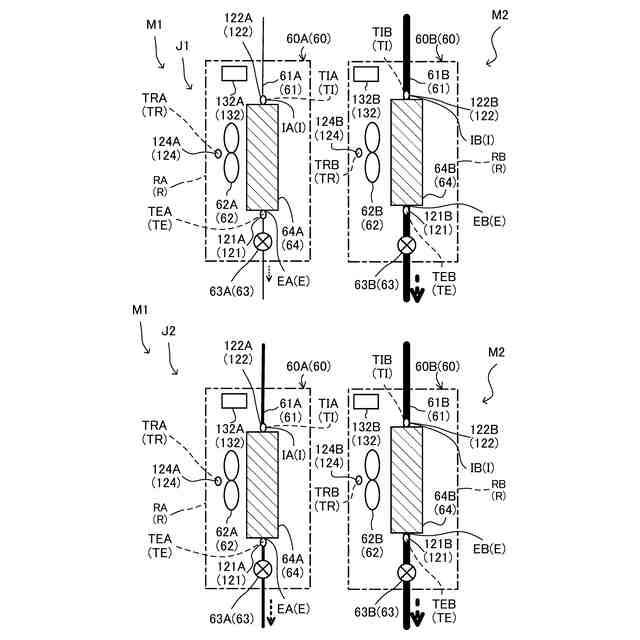 前記膨張弁(63)は、前記第1放熱器(64A)に対応する第1膨張弁(63A)と、前記第2放熱器(64B)に対応する第2膨張弁(63B)と、を含み、