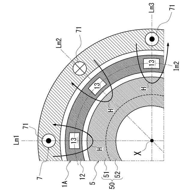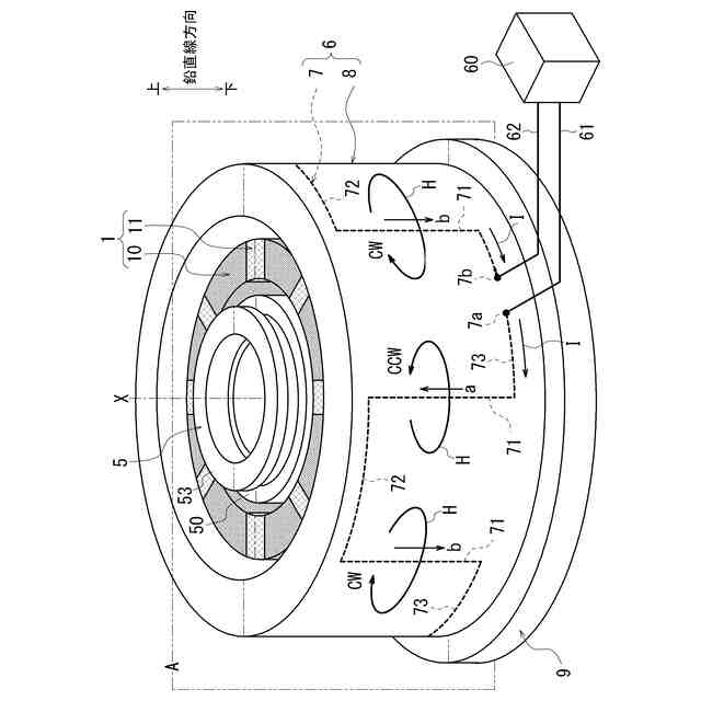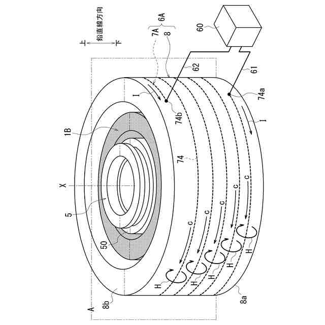前記誘導コイルは、前記電機子の外周側又は内周側の少なくとも一方で、前記回転軸方向の一方側から他方側に向かうにつれて、前記回転軸周りの周方向で位相をずらした螺旋状に設けられており、