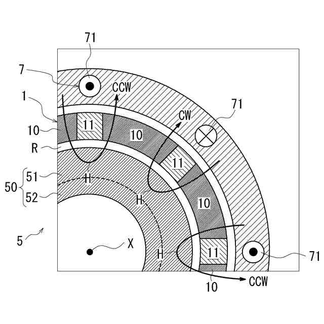 前記回転軸方向から見て、前記磁化領域と前記非磁化領域は、前記回転軸周りの周方向に交互に設けられており、