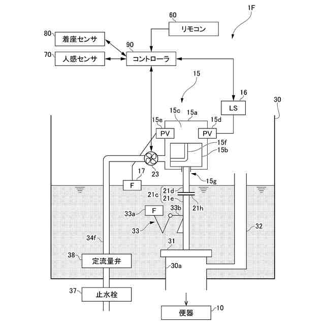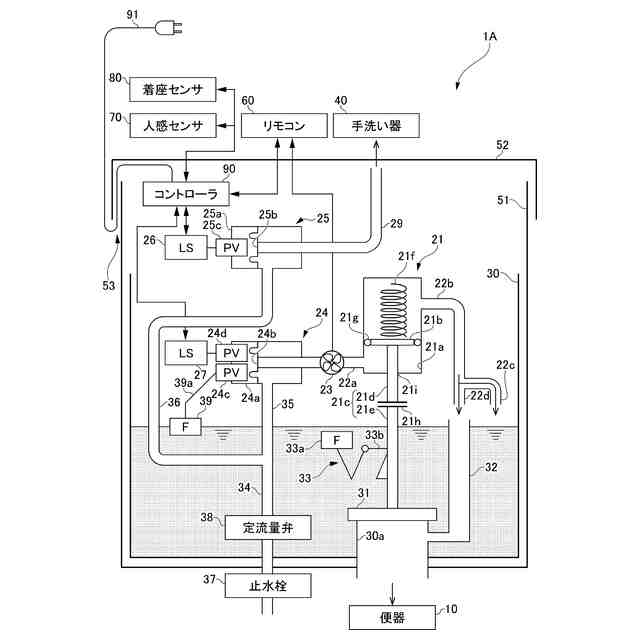 前記リモコン、前記人感センサ及び前記着座センサからの信号を取得して前記洗浄水タンク装置を制御するコントローラと、をさらに備え、