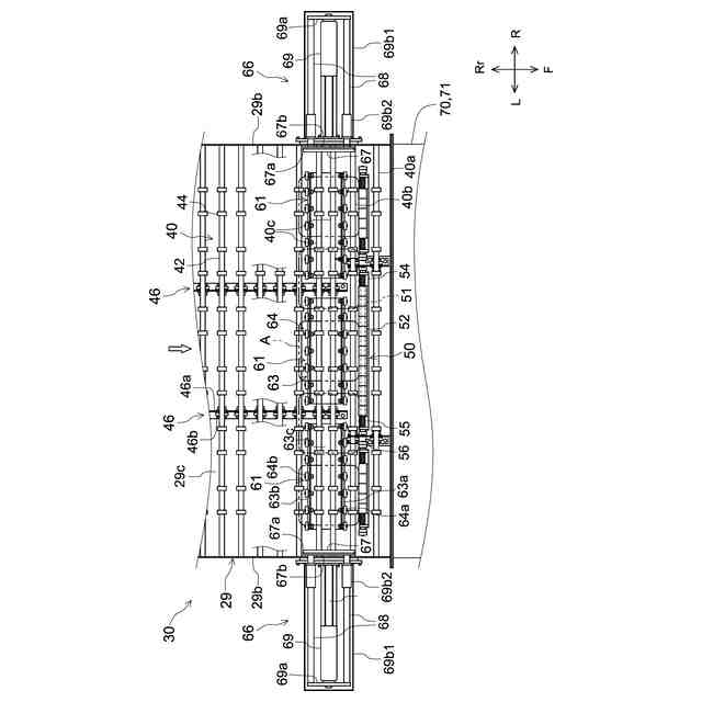 図1は、熱処理装置10を示す模式図である。図中、被搬送物Aが搬送される方向は、矢印で示されている。図2は、搬送装置30の模式図である。図2では、上方から見た搬送装置30の平面図が模式的に示されている。図2では、ストッパ50によって整列する被搬送物Aの位置は、二点鎖線で示されている。図3は、ストッパ50の模式図である。図3では、前方から後方に向かって見たストッパ50が示されている。図3では、上昇している状態のストッパ50が示されており、下降している状態のストッパ50の位置は、二点鎖線で示されている。図3では、搬送ローラ40の図示は省略されている。図4は、幅寄せ装置60の模式図である。図4では、前方から後方に向かって見た幅寄せ装置60が示されている。図4では、幅寄せ時の当て板67および被搬送物Aが示されており、幅寄せ前の当て板67および被搬送物Aは、二点鎖線で示されている。また、図4では、被搬送物Aが持ち上げられる前の支持ローラ64は、二点鎖線で示されている。