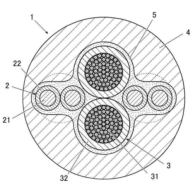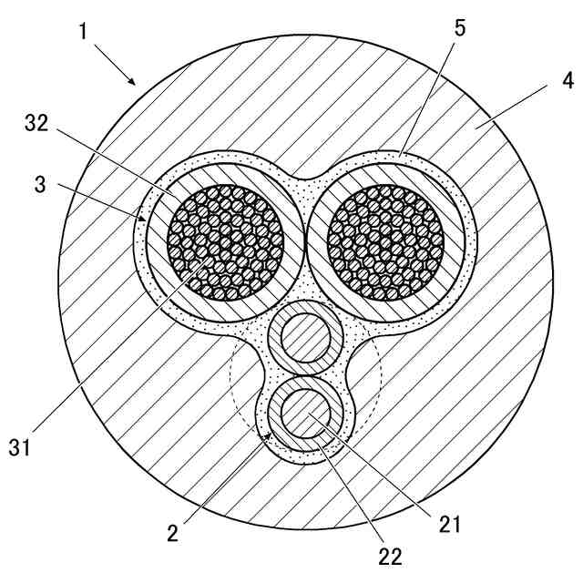 複数の信号線2と複数の電源線3とがケーブルコアを構成し、ケーブルコアと外部シース4との間には、滑剤5が封入されている。