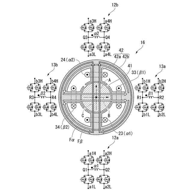 【解決手段】磁気部品16は、空間位相で直交する第1軸A及び第2軸Bの交点Cを挟んで各軸A,Bに沿った方向に配置される4つのティース部42aと、第1軸Aに沿った2つのティース部42aに装着される各α相コイルα1,α2と、第2軸Bに沿った2つのティース部42aに装着される各β相コイルβ1,β2とを備える。磁気部品16は、各コイルα1,α2,β1,β2に流れる電流の方向によって、各α相コイルα1,α2の磁束方向Fαが同一になるように、及び、各β相コイルβ1,β2の磁束方向Fβが同一になるように使用される。