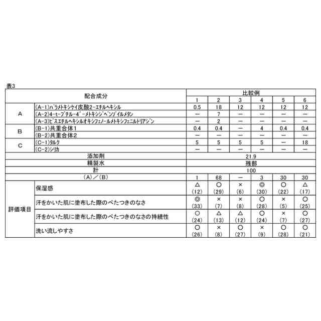 一方で夏場に日焼け止め化粧料を使用する際は、汗をかきべたついた肌に対して塗布する場面も想定される。日焼け止め化粧料以外の化粧料においては特許文献3のような、肌のべたつきを抑制し、さらさら感とその持続性を向上させるために、無水ケイ酸、カチオン性ポリマ-、ノニオン性ポリマ-、水を含む弱酸系の粉体含有化粧料が提案されている。しかし紫外線吸収剤は一般的にべたつきを引き起こしやすく、汗をかいた肌に塗布した際にもべたつかず、そのべたつきのなさが持続するような日焼け止め化粧料は開発されていなかった。
