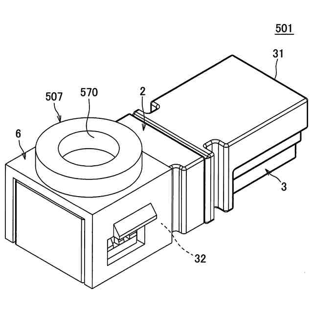 第1カバー2は、透光性の合成樹脂で構成されている。第1カバー2は、ハウジング3に組み付けられて部品収容部32の開口箇所を閉塞している。第2カバー6は、透光性の合成樹脂で構成されている。第2カバー6は、第1カバー2に重ねられて第1カバー2に組み付けられている。防水部材507は、第2カバー6の表面に取り付けられている。防水部材507は、2つのLED54からの光を通す円形の通し孔570を有するリング状に形成されている。