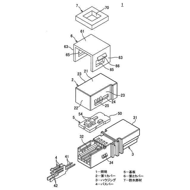 照明501は、光源である2つのLED(Light Emitting Diode)54が搭載された基板5と、バスバーと、ハウジング3と、第1カバー2及び第2カバー6と、スポンジ製の防水部材507と、を備えている。