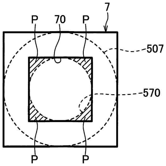 上記照明501においては、防水部材507がリング状であり、LED54を複数個使用する際には、図11に示すようにリング状の防水部材507によってLED54の端部光(図11に破線で示す。)が遮られてしまう構造となっている。即ち、図11は、防水部材507の中心から外れた部位の断面図であり、中心から外れているがゆえに通し孔570が狭くなっており、そのためにLED54の端部光が遮られてしまっている。なお、図11においては、第1カバー2、第2カバー6、ハウジング3の図示を省略している。また、防水部材507がリング状であるがゆえに、第2カバー6における防水部材507の取付面の四隅に光の透過部が存在してしまい、該四隅から光漏れが生じる恐れがあった。