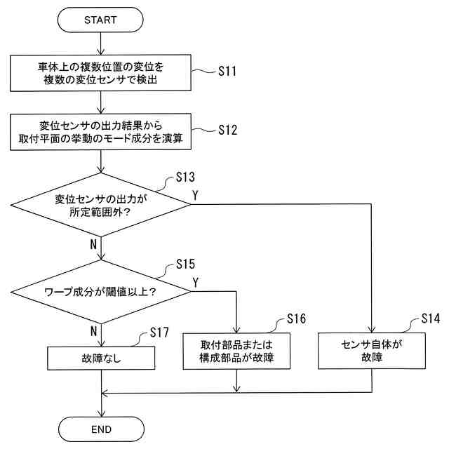 前記複数の変位センサのうちいずれかの前記変位センサの出力結果と演算した前記変位との間の差分が閾値以上である場合に、前記複数の変位センサのうち前記いずれかの変位センサ、前記いずれかの変位センサを車両に取り付けている取付部品又は前記取付部品により前記いずれかの変位センサが取り付けられている前記車両の構成部品が故障していると判定する、