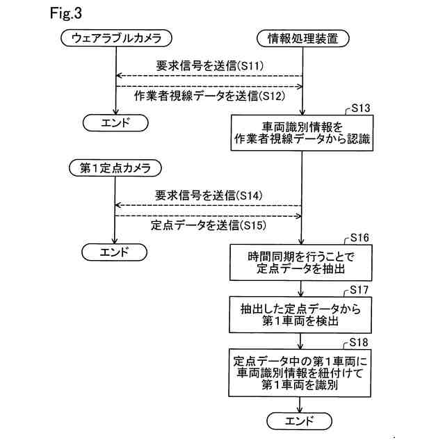 (2)上記形態であって、前記定点データと前記作業者視線データとはそれぞれ、複数の異なるタイミングで撮影されたデータを含み、前記検出部は、前記定点データの撮影時刻と、前記作業者視線データの撮影時刻と、を対応づける時間同期を行うことで、前記移動体識別情報が認識された前記作業者視線データに対応する前記定点データを抽出し、抽出した前記定点データから前記移動体を検出してもよい。この形態によれば、情報処理装置は、時間同期を行い、移動体識別情報が認識された作業者視線データに対応する定点データを抽出できる。そして、情報処理装置は、抽出した定点データから移動体を検出できる。