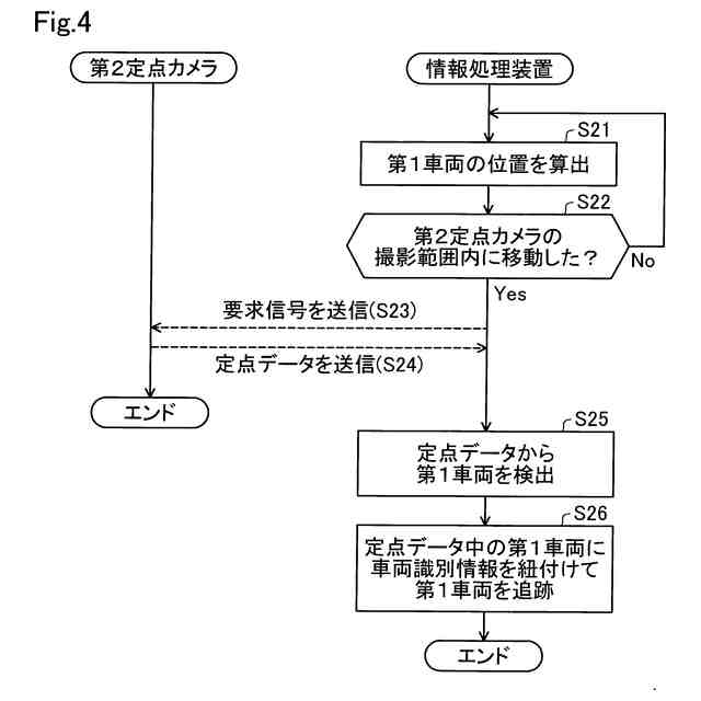 (3)上記形態であって、前記取得部は、異なる場所に設置された複数の前記定点カメラからそれぞれ出力される複数の前記定点データを取得し、前記移動体識別情報が紐付けられた前記移動体が、一の前記定点カメラの撮影範囲内から、前記一の定点カメラとは異なる他の定点カメラの撮影範囲内に移動した場合に、前記検出部は、前記他の定点カメラから出力された前記定点データから前記移動体を検出し、前記識別部は、前記検出部によって検出された前記他の定点カメラ中の前記移動体に、前記移動体識別情報を紐付けることで、複数の前記定点カメラの前記撮影範囲間で前記移動体を識別して追跡してもよい。この形態によれば、移動体識別情報が紐付けられた移動体が、一の定点カメラの撮影範囲内から他の定点カメラの撮影範囲内に移動した場合に、情報処理装置は、複数の定点カメラの撮影範囲間で移動体を識別して追跡できる。