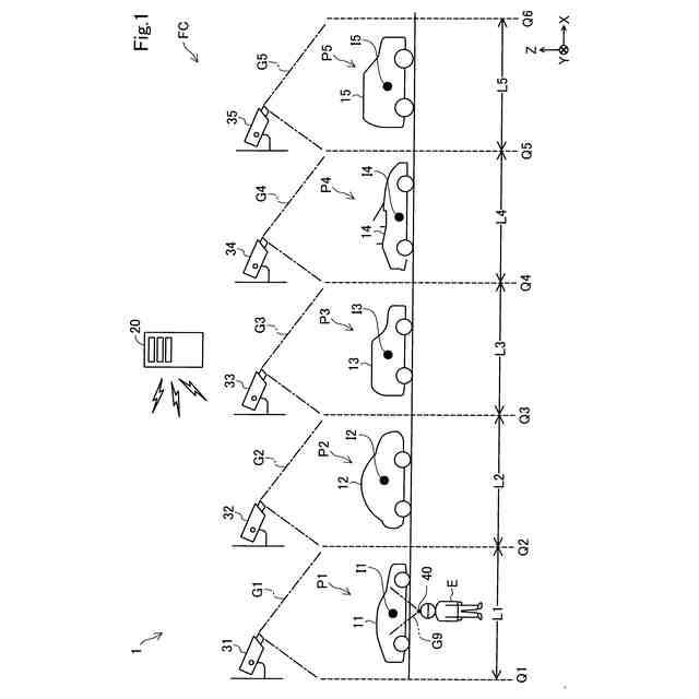 定点カメラ31~35は、車両11~15の製造場所L1~L5を俯瞰して撮影する。定点カメラ31~35は、検出結果として、定点データを出力する。本実施形態では、定点データは、動画データである。つまり、定点データは、複数の異なるタイミングで撮影されたデータを含む。定点カメラ31~35は、図示しない通信装置を備えており、有線通信あるいは無線通信により、情報処理装置20等の他の装置と通信できる。定点カメラ31~35は、例えば、工場FCにおいて、車両11~15の製造場所L1~L5における天井、壁、支柱等の支持部材に固定されている。