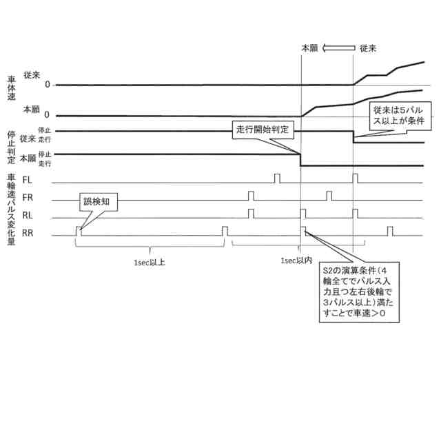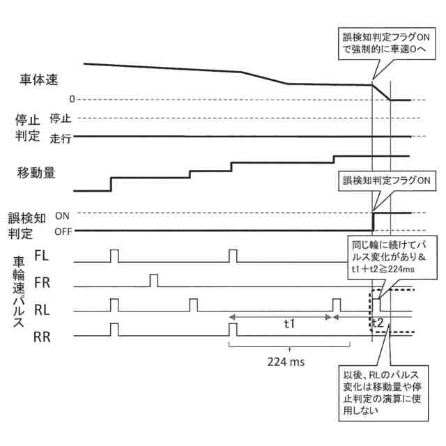 【解決手段】車両が備える複数の車輪の内、一部の特定車輪以外の車輪から車輪速パルスが取得されない状態で特定車輪のみから連続して車輪速パルスが取得された場合であって、且つ連続した車輪速パルスを取得したのが特定車輪以外の車輪から最後に車輪速パルスが取得されてから第1時間以上経過している場合に、特定車輪から車輪速パルスが誤って取得されている状態であることを示す誤検知判定フラグをオンし、誤検知判定フラグがオンされた状態では特定車輪から車輪速パルスの取得がされていないとみなして停止状態と走行状態の判定を行うように構成する。