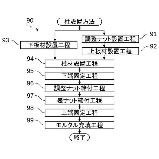 【解決手段】調整ナット設置工程91において、上構造体10から下方へ向けて突出した棒材12a~12dにナット61a~61dを螺合させる。上板材設置工程92において、板材30に設けられたボルト孔32a~32dに、棒材12a~12dの先端部分を挿通する。柱材設置工程94において、板材30と下構造体20との間に柱材50を配置する。調整ナット締付工程97において、ナット61a~61dを回転させて締め付けることにより、板材30を柱材50の上端面に押し付ける。モルタル充填工程99において、板材30と上構造体10との間にモルタル81を充填して固化する。上構造体10にクリープ変形が生じることにより、上構造体10の荷重が柱材50に伝達される。