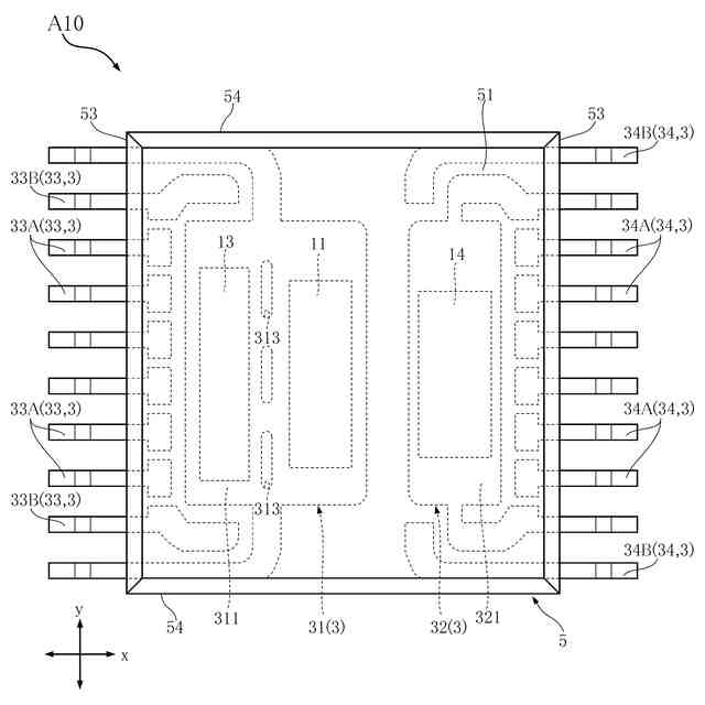 図31は、第3実施形態にかかる半導体装置を示す平面図であって、封止樹脂を想像線で示した図である。
