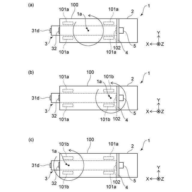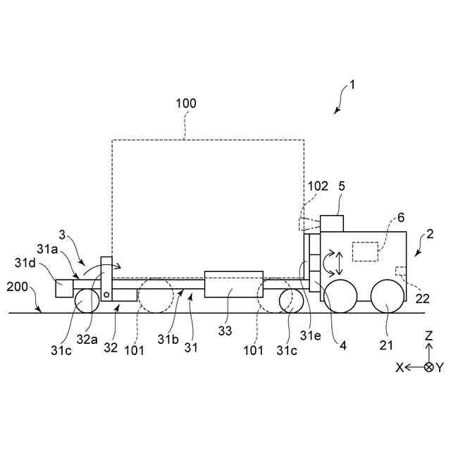 また、各図中における矢印X、Y、Zは、互いに直交する三方向を表している。例えば、矢印Xは、駆動部2から従動部3に向かう方向(長さ方向)とすることができる。例えば、矢印Yは、駆動部2から従動部3に向かう方向に直交する方向(幅方向)とすることができる。例えば、Z方向は、台車100の車輪101の接地位置が含まれる面に垂直な方向とすることができる。