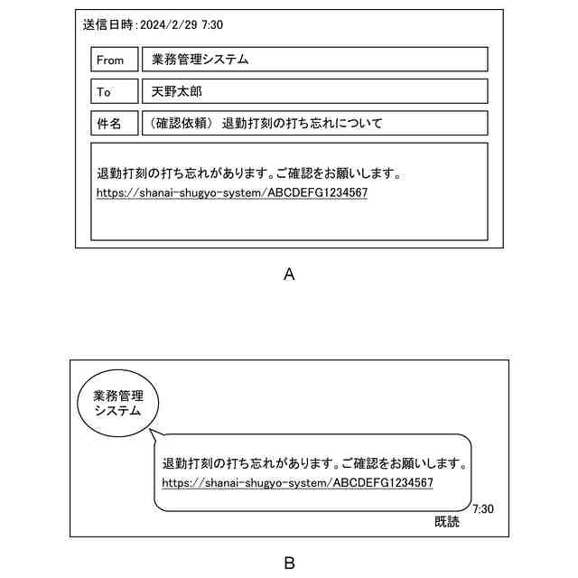 特許文献1には、ユーザが勤怠入力の意思を直接表明しなくても、先制的にユーザに勤怠入力を自動要請することができる勤怠管理方式を実現するために、勤怠記録に対する要請メッセージを、勤怠時間情報を基準として送信する旨が開示されている。