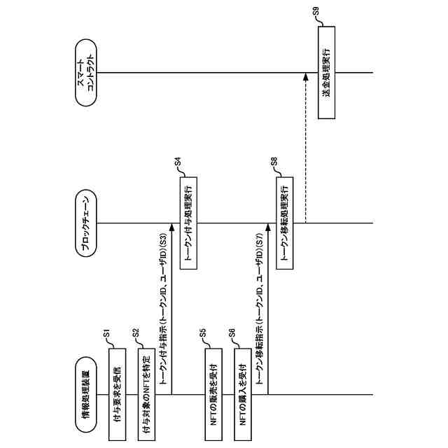 前記スマートコントラクトは、前記ブロックチェーン上で、ユーザに付与する対象の複数の非代替性トークンの中に、一度も移転していない非代替性トークンが存在していることを条件として、前記送金処理を行う、