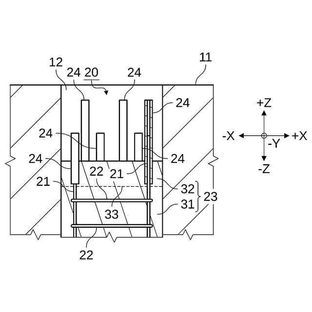 杭造成工程では、杭20を造成する。杭20は、例えば現場造成杭であり、地表11から下向き(-Z方向)に掘削した杭穴12のなかに、複数の主筋21及び複数の帯筋22を組み立てた骨組みを挿入し、コンクリート23を打設することにより造成される。