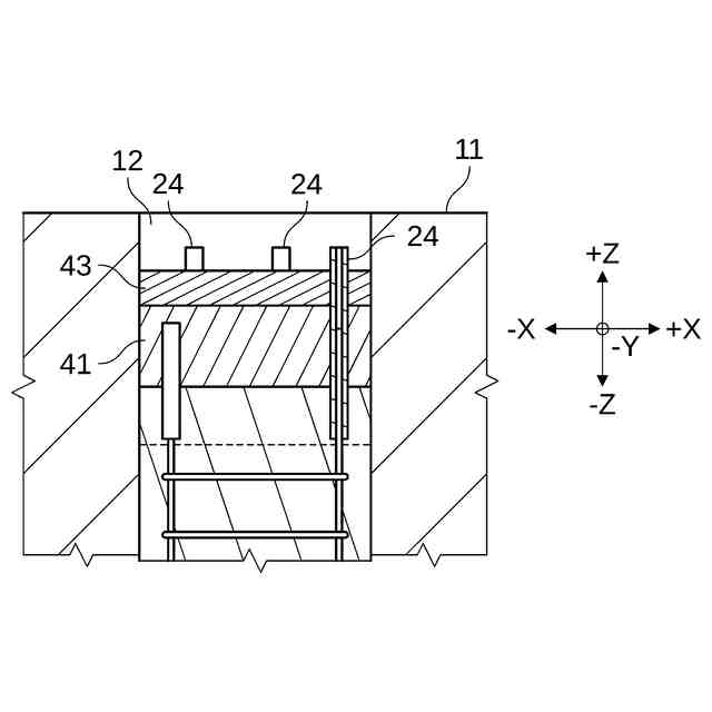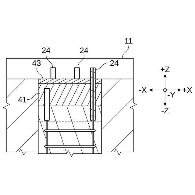 主筋21は、例えば、上下方向(±Z方向)に延びる鉄筋であり、コンクリート23のなかに埋設され、上端部分がコンクリート23の上端面から上(+Z方向)へ向けて延びて露出している。主筋21の上端は、地表11よりも低い位置にある。