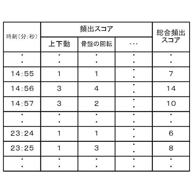ユーザの運動に関する複数の指標値のそれぞれに対応する頻出スコアを時刻毎に合計させ、合計値を時刻毎の総合頻出スコアとして確定させ、