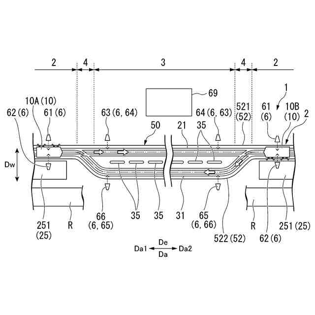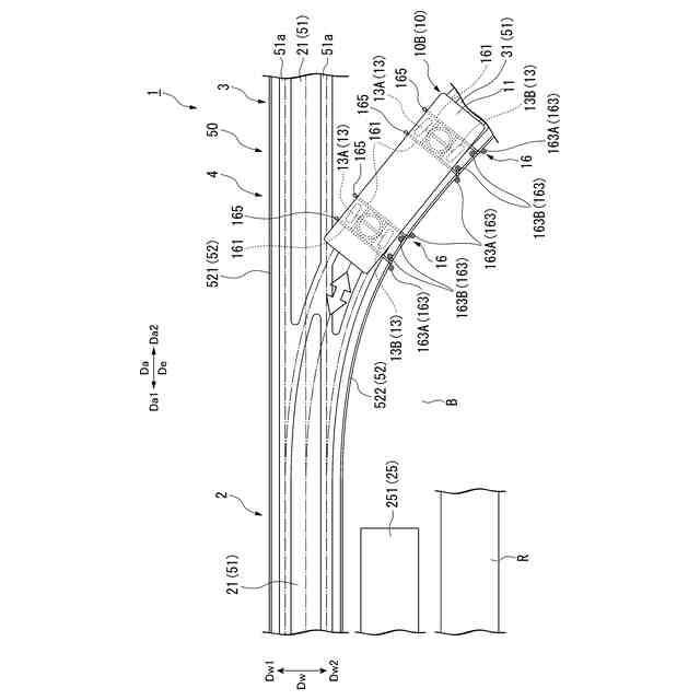 ところで、軌道系交通システムでは、コスト削減の観点からは、高架とせず、道路上に軌道を敷設することが望ましい。一方で、道路上に軌道を敷設した場合には、駅は、高架にされることなく、道路と同じレベルで設置されている。このような軌道において、駅が道路に対して軌道を挟んで反対側に配置されている場合、利用者が駅にアクセスするための高架橋や地下道を設置することがある。しかしながら、高架橋や地下道を設置した場合には、建設費が高額になる虞がある。また、高架橋や地下道を設置しない場合には、軌道を横切るために、信号設備や踏切等が必要となる。しかしながら、信号設備や踏切等を設置した場合には、コストが上昇するだけでなく、信号や踏切が不定期に作動した場合、車両が停止することになり、車両の輸送量が低下する可能性がある。さらに、高架橋や地下道や信号設備や踏切等が設置されている場合には、高齢者や障害者等には、駅へのアクセスへの障害となる虞もある。したがって、高架橋や地下道や信号設備や踏切等を設置することなく、駅へアクセス可能な構造が望まれている。