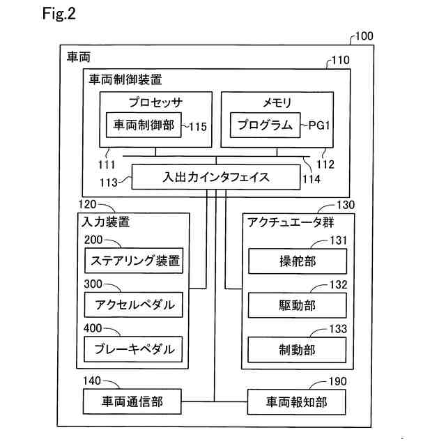 図2は、車両100の構成を示すブロック図である。車両100は、車両制御装置110と、入力装置120と、アクチュエータ群130と、車両通信部140と、車両報知部190と、を備える。