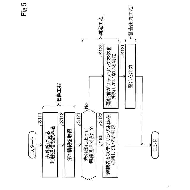前記第1情報が、前記ステアリング通信部と前記デバイス通信部とが赤外線によって無線通信できたことを示す情報である場合に、前記運転者が前記ステアリング本体を把持していると判定し、