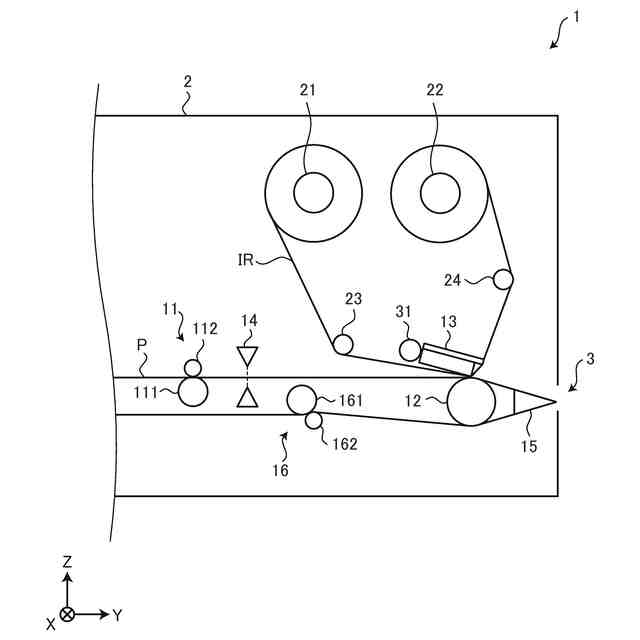 なお、図1において、X軸は、ラベルプリンタ1を左右に貫き、ラベルプリンタ1の左側から右側に向かう軸である。Y軸は、ラベルプリンタ1を前後に貫き、ラベルプリンタ1の後方から前方に向かう軸である。Z軸は、ラベルプリンタ1を上下に貫き、ラベルプリンタ1の下方から上方に向かう軸である。以下では、Y軸の正方向側をラベルプリンタ1の正面側ともいう。また、Y軸の負方向側をラベルプリンタ1の奥側ともいう。