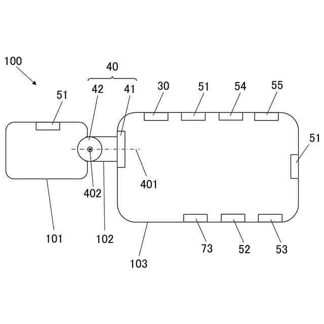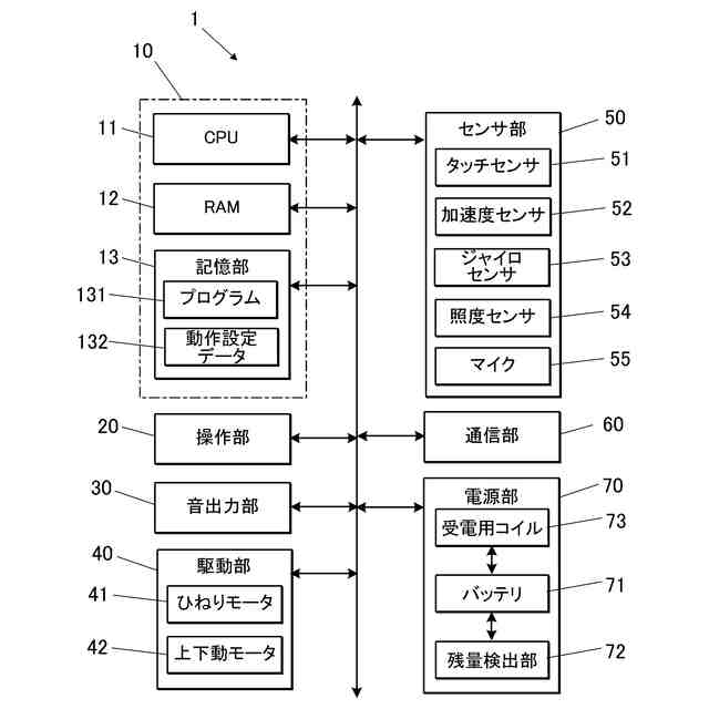 図2に示すように、ロボット1の本体100は、頭部101と、胴体部103と、頭部101及び胴体部103を連結する連結部102と、を有する。以下では、ロボット1のうち頭部101に相当する部分を「首」と記す。本体100は、頭部101を胴体部103に対して動かすための駆動部40を有する。駆動部40は、ひねりモータ41及び上下動モータ42を有する。ひねりモータ41は、頭部101及び連結部102を、連結部102の延在方向に延びる第1回転軸401を中心に所定の角度範囲内で回転させるサーボモータである。ひねりモータ41の動作により、ロボット1が首をひねる動きが実現される。上下動モータ42は、第1回転軸401に垂直な第2回転軸402を中心に頭部101を所定の角度範囲内で回転させるサーボモータである。上下動モータ42により、ロボット1が首を上下させる動きが実現される。首の上下動の方向は、ひねりモータ41による首のひねりの角度により、鉛直方向に対して傾斜した方向にもなり得る。ひねりモータ41及び/又は上下動モータ42を細かく周期的に動作させることで、ロボット1が首を揺動させたり震えたりする動きが実現される。ひねりモータ41及び上下動モータ42の動作のタイミング、大きさ、及び速さを適宜変更して組み合わせることにより、ロボット1に多様な動作、例えば、喜ぶ動作、驚く動作、生き物の呼吸を模した呼吸動作(自発的な動作)等を行わせることができる。