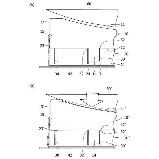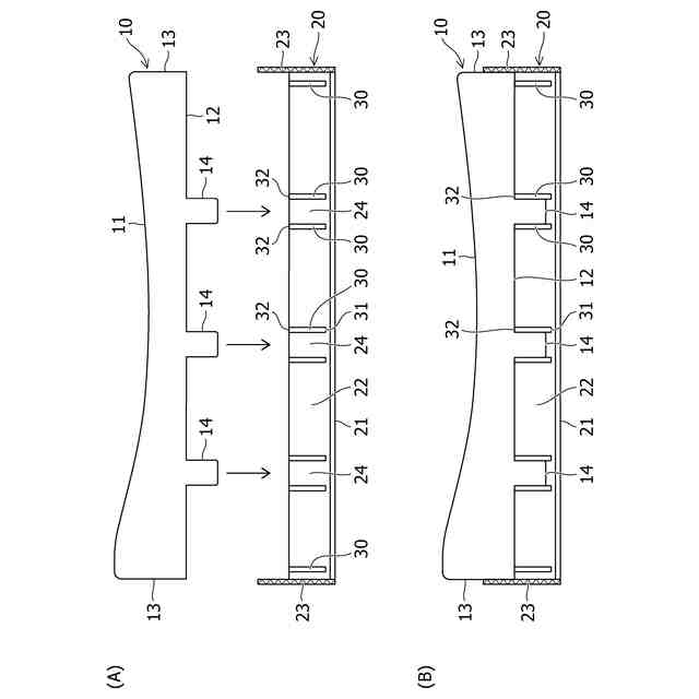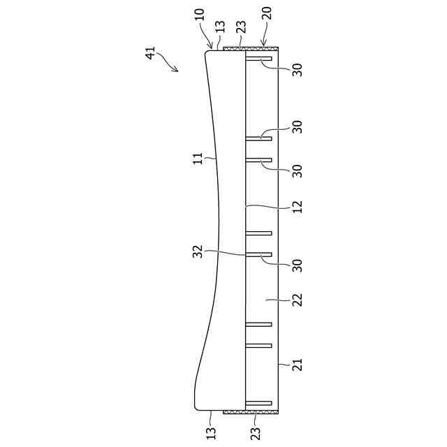 前記第1緩衝部材は、前記表面および前記裏面を有しかつ第1の幅を有して長手方向に延びる本体部と、前記本体部の前記裏面に前記長手方向に間隔を有して突設された複数の脚部とを備えており、