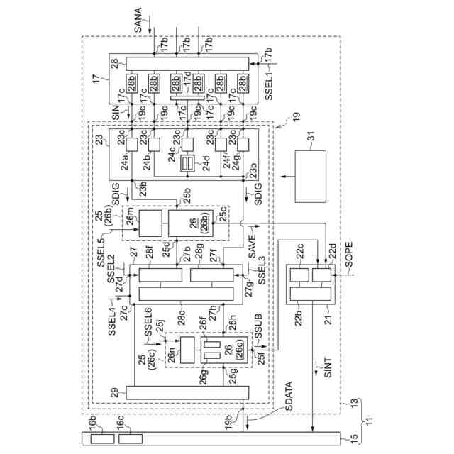 前記演算回路の前記平均化回路は、前記アナログディジタル変換器からの前記変換値を受けるように構成される1又は複数の第1入力、前記演算結果を示す平均化信号を提供するように構成される第1出力、及び前記ディジタル演算を適用せずに前記アナログディジタル変換器からの前記変換値を提供するように構成される複数の第2出力を有し、