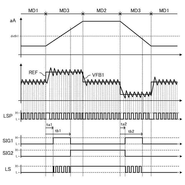 前記レベル切替信号出力回路の状態は、前記基駆動信号の値が変化する変化期間において、前記帰還信号に応じて前記第1電位と前記第2電位とで変化する前記レベル切替信号を出力する第1状態と、前記第1電位又は前記第2電位で一定の前記レベル切替信号を出力する第2状態と、を含む、