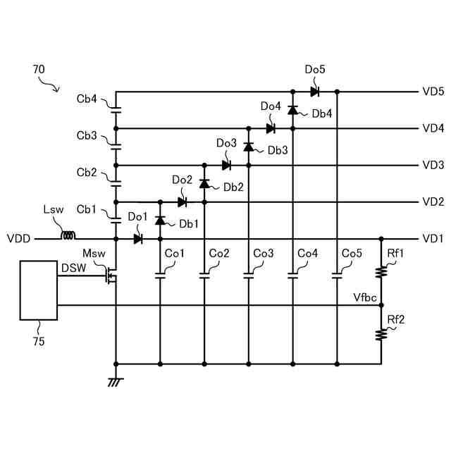 前記昇圧回路は、第3~第n出力ダイオード素子、第3~第n出力コンデンサー素子、第2~第n-1充電ダイオード素子、及び第2~第n-1充電コンデンサー素子を有し、第3~第n電圧信号を出力し、