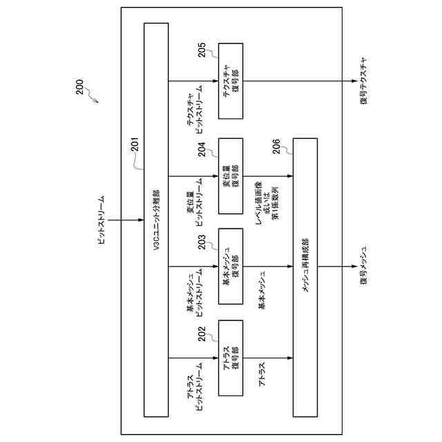 【解決手段】本発明に係るメッシュ復号装置200のパッチ対応付け部206Aは、アトラスに含まれるパッチと基本メッシュとを対応付けることによって対応付け基本メッシュを生成して出力する基本メッシュ対応付け部206A1と、レベル値画像或いは第1係数列の種別を判定することによってレベル値画像及び第1係数列のうち判定されたいずれかを変位量として出力する変位量種別判定部206A2と、パッチと変位量とを対応付けることによって対応付けレベル値画像或いは対応付け第1係数列を生成して出力する変位量対応付け部206A3とを備える。