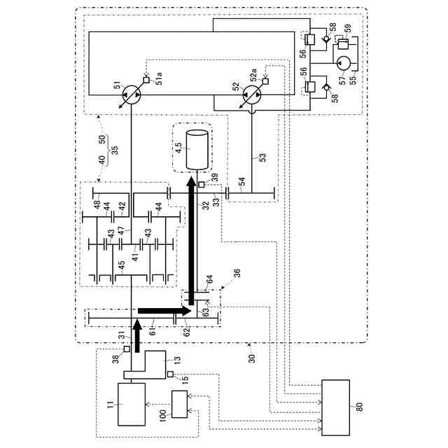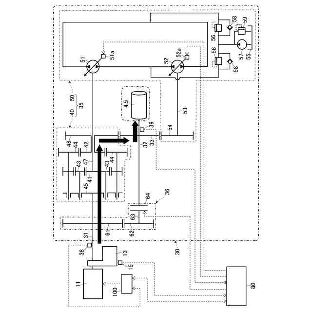 CVTの一つに静油圧式無段変速機(Hydro Static Transmission:HST)がある。HSTは、可変容量型の油圧ポンプと油圧モータを組み合わせた油圧閉回路により構成された変速機である。HSTにおいては、油圧ポンプ又は油圧モータの押しのけ容積を連続的に変更することによって、無段変速となり、かつ、原理的な変速範囲は無制限となる。しかし、流体を介して動力を伝達するので、CVTの中では効率が相対的に低くなり、さらに、変速範囲の両端付近では更に効率が低下してしまう。そのため、HSTでは、実際に適用可能な変速範囲が限られてしまう。
