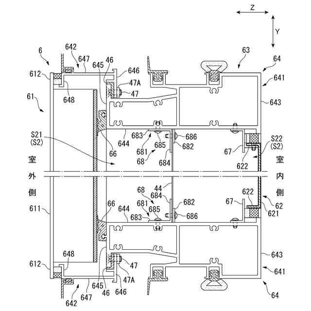 なお、図1に示すカーテンウォール1の左右方向をX軸方向とし、カーテンウォール1の上下方向をY軸方向とし、カーテンウォール1の室内外方向(見込み方向)をZ軸方向とする。X,Y,Z軸方向は互いに直交する。