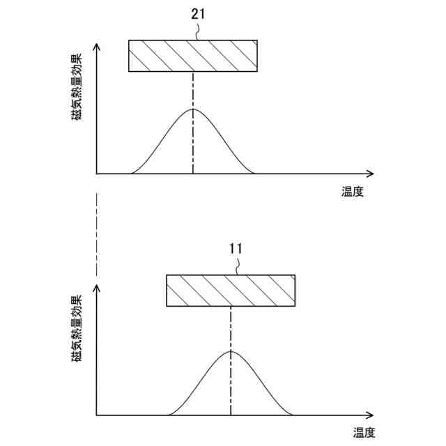 第1動作温度域を持つ前記第1固体冷媒物質(12)を収容する前記複数の第1冷媒収容部(11)と、前記第1動作温度域と異なる第2動作温度域を持つ前記第2固体冷媒物質(22)を収容する前記複数の第2冷媒収容部(21)とが、同一の前記収納ケース(10,20)に配置され、直列に接続される、