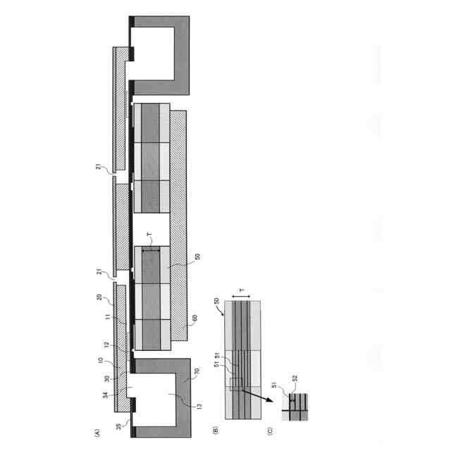 本発明の実施形態に係る液体吐出ヘッドとしてのインクジェットヘッドの構成例を説明する。図1は、インクジェットヘッドの一例を説明する断面図であり、(A)にインクジェットヘッド全体の概略図、(B)に電極積層部の拡大図、(C)に電極層と圧電層との拡大図を示す。図2は図1の平面図である。また、図1は、図2に示すI-I線に沿った断面を示している。
