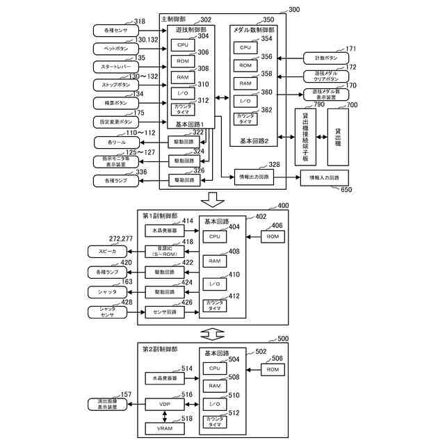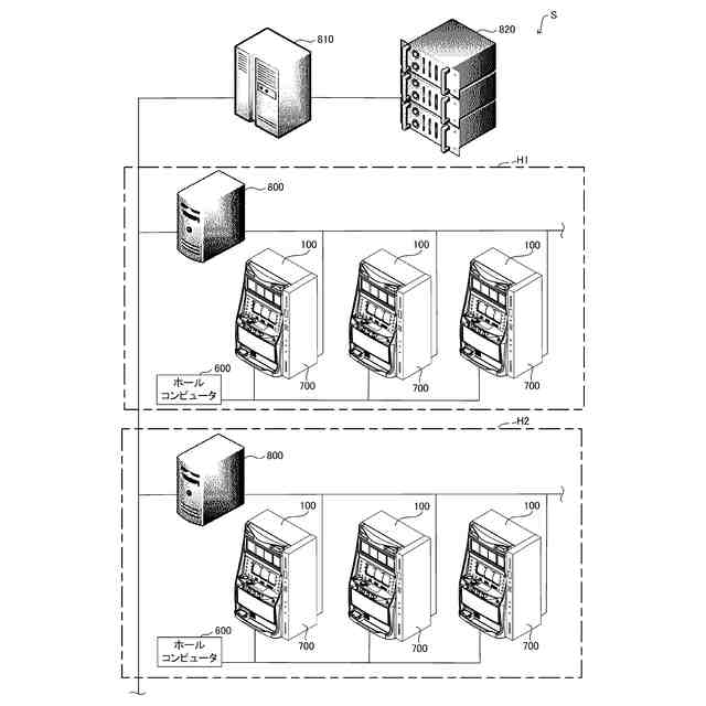 図1に示すスロットマシン100および貸出機700を含む遊技システムの構成図である。