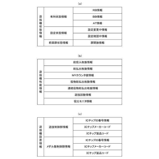 遊技機状態情報、遊技機性能情報や、および遊技機設置情報をまとめた表である。