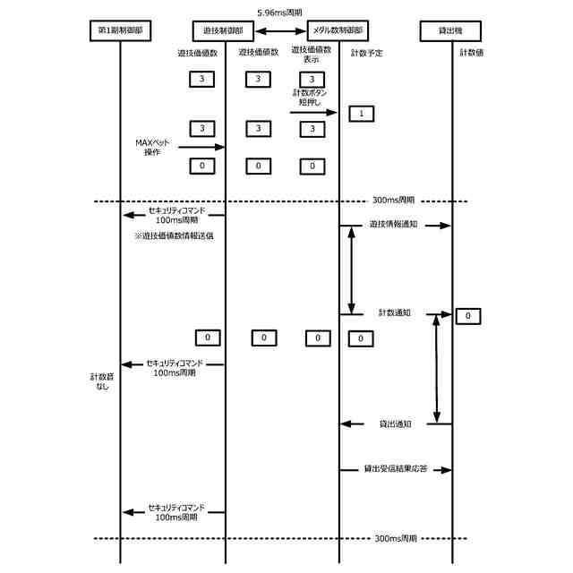 遊技制御部302からメダル数制御部350に遊技制御状態コマンドが送信された場合の通信シーケンスを示す図である。