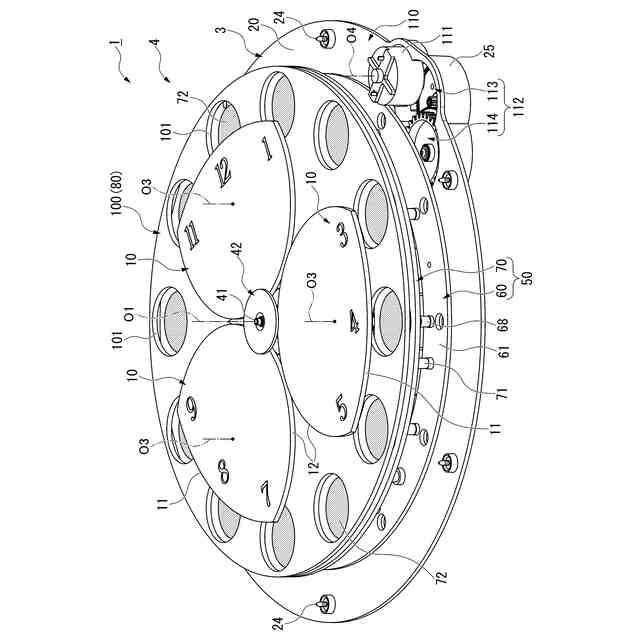 (2)複数の前記歯車は、前記第1回転体に第2軸線回りに回転可能に支持された複数の第1歯車と、前記第2回転体に第3軸線回りに回転可能に支持された複数の第2歯車と、を含み、前記装飾体は、複数の前記第1歯車のそれぞれに回転不能に取り付けられた第1装飾体と、複数の前記第2歯車のそれぞれに回転不能に取り付けられた第2装飾体と、を含んでも良い。